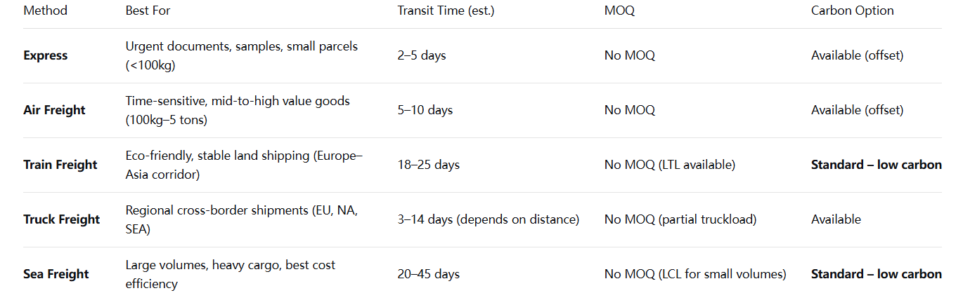 Note on MOQ: We have no minimum order quantity (MOQ) for any transport mode. Whether you need to ship a single carton via express or a 40ft container via sea, we provide a tailored quote.